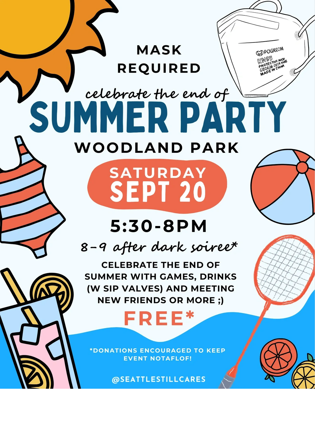Join us at Woodland Park from 5:30-8 PM** We will have summer activities, non alcoholic drinks to sip (through drinking valves), and lots of time to meet friends new and old. From 8-9 PM we will have speed dating to meet covid cautious cuties ;) (21+ only)